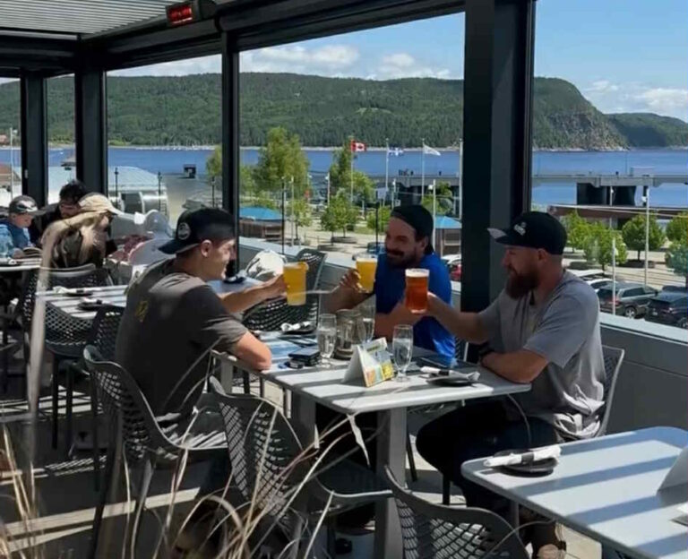 Installée sur le toit de la microbrasserie, la terrasse offre une vue à couper le souffle sur le fjord du Saguenay. Que vous soyez assis au bar, à une table ou confortablement installé autour d’un foyer, vous aurez devant vous l’eau à perte de vue, une infinité d’arbres longeant le Saguenay et, tout au long de l’été, le spectacle des imposants navires de croisière.