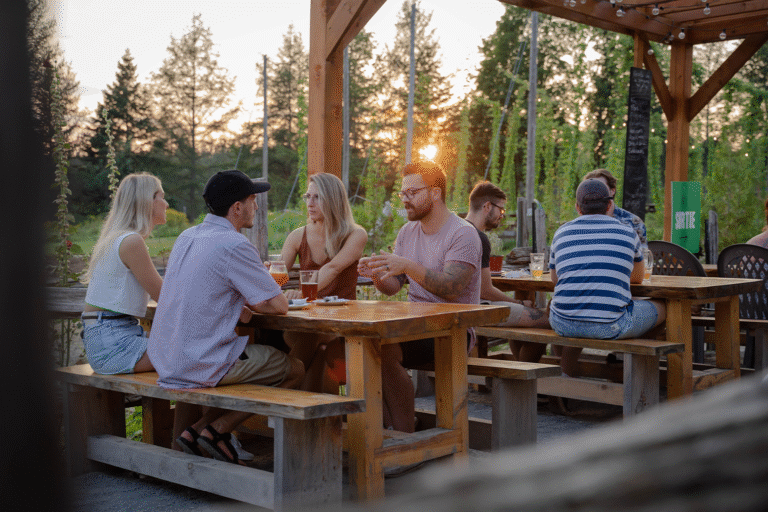 Ancrée dans son milieu naturel, la terrasse offre une vue apaisante sur les montagnes et la nature environnante. En plus de la terrasse attenante au pub, plusieurs attraits bonifient l’expérience sur notre terrain : une houblonnière avec tables à pique-nique l’été, une cabane à sucre en activité au printemps, un jardin qui alimente notre cuisine, ainsi qu’un poulailler.